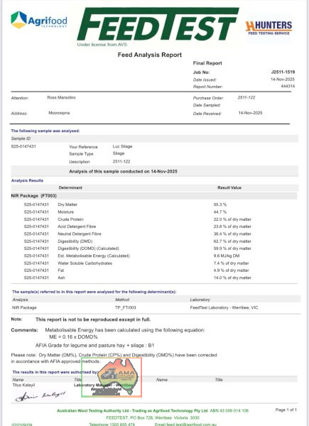 Quality Lucerne Silage Rolls ~ New Season ~ baled 15/09/2025 ~ No weather damage ~ Tight heavy rolls, ~ Loader available ~ Price per roll ~ upto 190 rolls.
